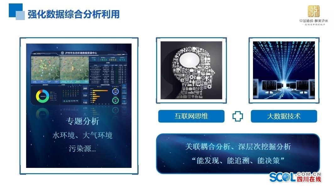 泸州市将抢抓“一带一路”,长江经济带和成渝地区双城经济圈建设重大机遇,坚持以“基础为支撑、数据为驱动、应用为核心”的思路,以“信息化促进环境业务管理和服务创新”为主线,不断探索提升区域生态环境监管、决策、公共服务和融合创新能力,着力打造大数据与环境监管工作高度融合的泸州实践,为推进生态高水平保护、经济高质量发展做出新的更大的贡献。(泸州市生态环境局供图)