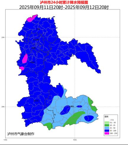 9月11日,泸州市气象台发布暴雨蓝色预警:预计9月11日傍晚到12日白天泸州市将出现一次强降雨天气过程,雨量大雨到暴雨(30~80毫米),个别地方降雨量将超过 150 毫米,强降雨时段伴有雷电、5~7级阵风,最大小时雨量40~60毫米。