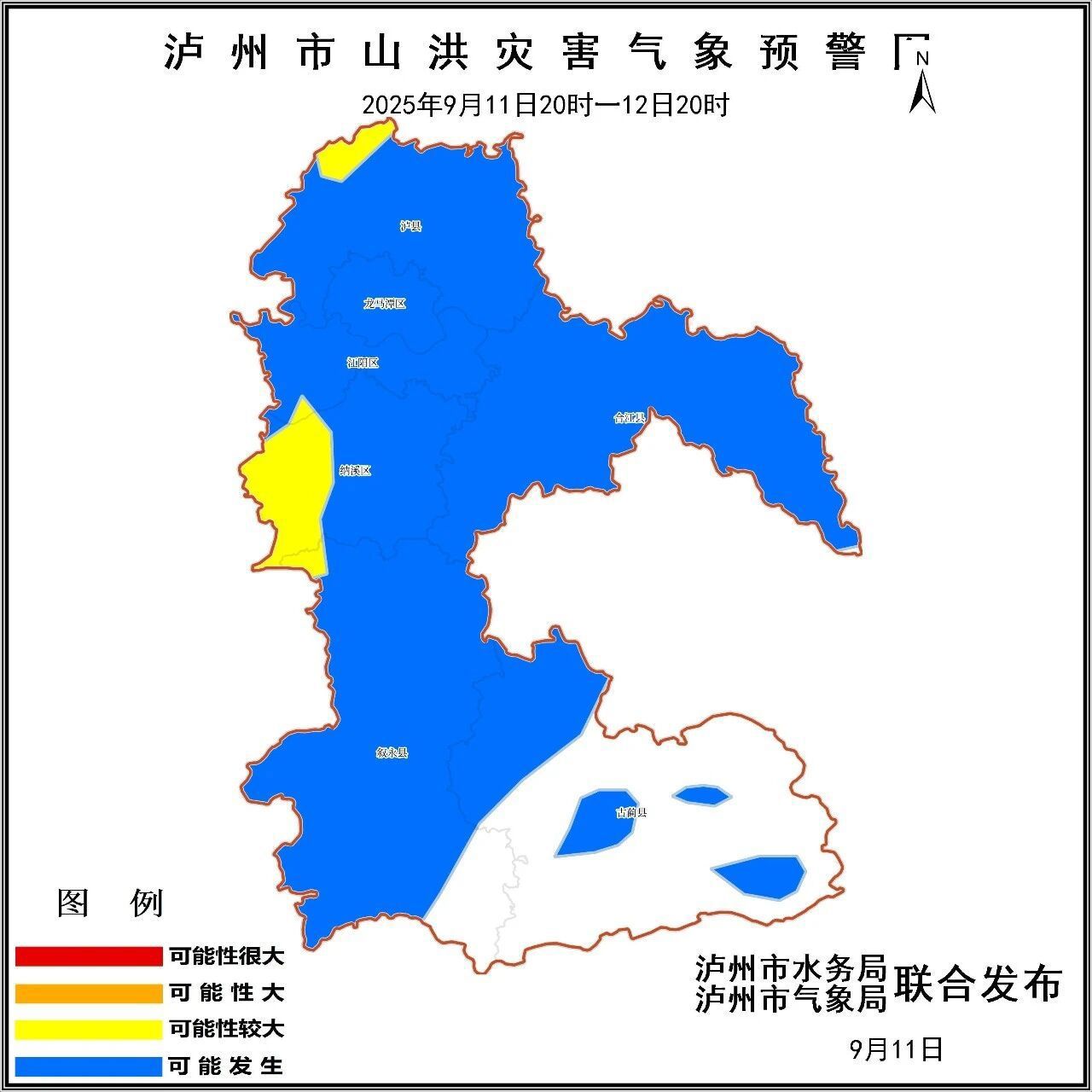 泸州市水务局、泸州市气象局9月11日16时30分发布山洪灾害黄色预警:预计9月11日傍晚到12日白天泸州市将出现一次强降雨天气过程,雨量大雨到暴雨(30-80毫米),个别地方降雨量将超过150毫米,最大小时雨量40-60毫米。纳溪区、泸县、江阳区、叙永县发生山洪灾害可能性较大(黄色);龙马潭区、合江县、古蔺县可能发生山洪灾害(蓝色)。