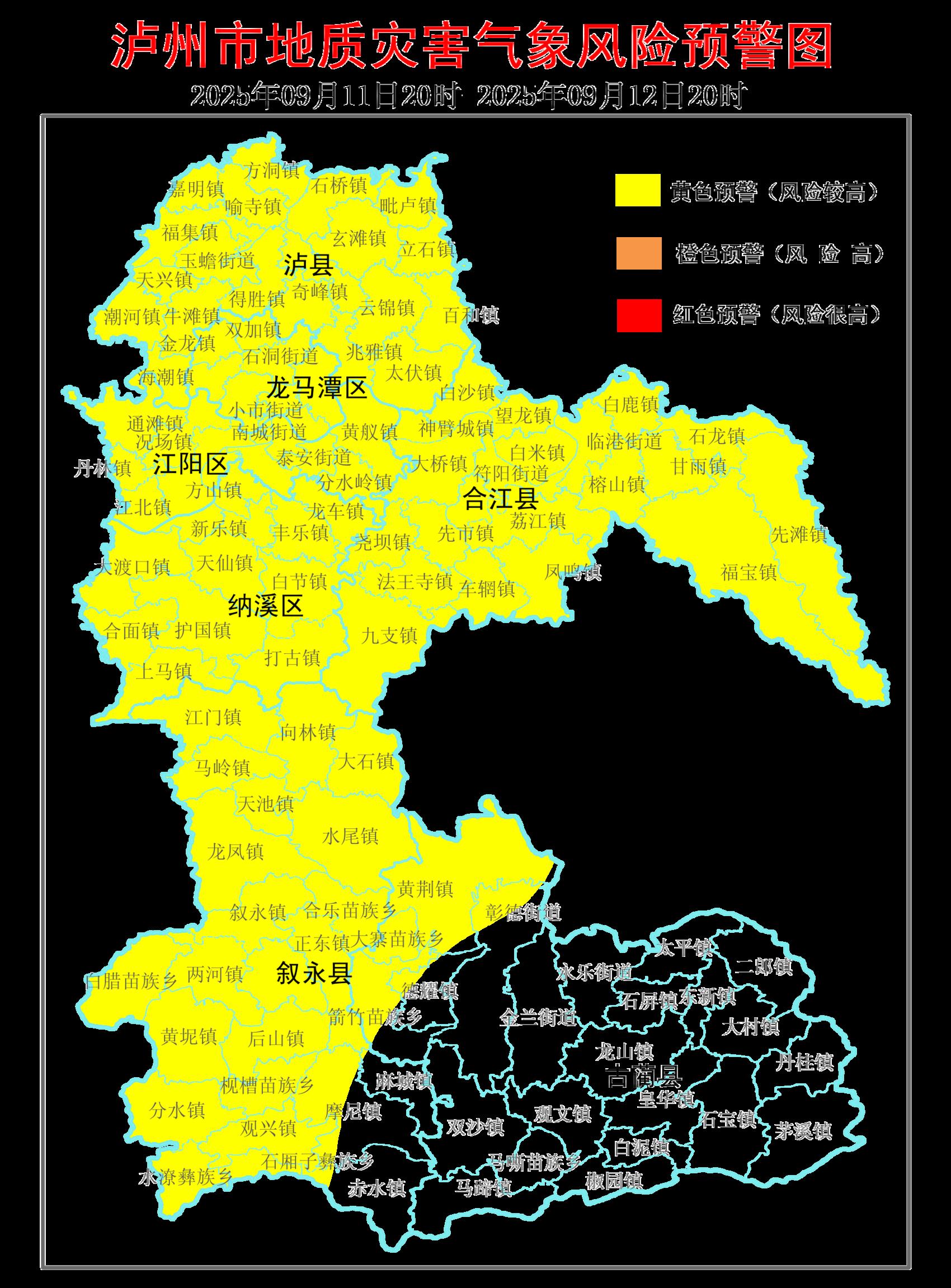 泸州市自然资源和规划局、泸州市气象局9月11日16时20分发布地质灾害黄色预警:预计9月11日20时至9月12日20时,江阳区、龙马潭区、纳溪区、泸县、合江县全域,叙永县大部,古蔺县局部发生地质灾害的风险较高(黄色预警)。