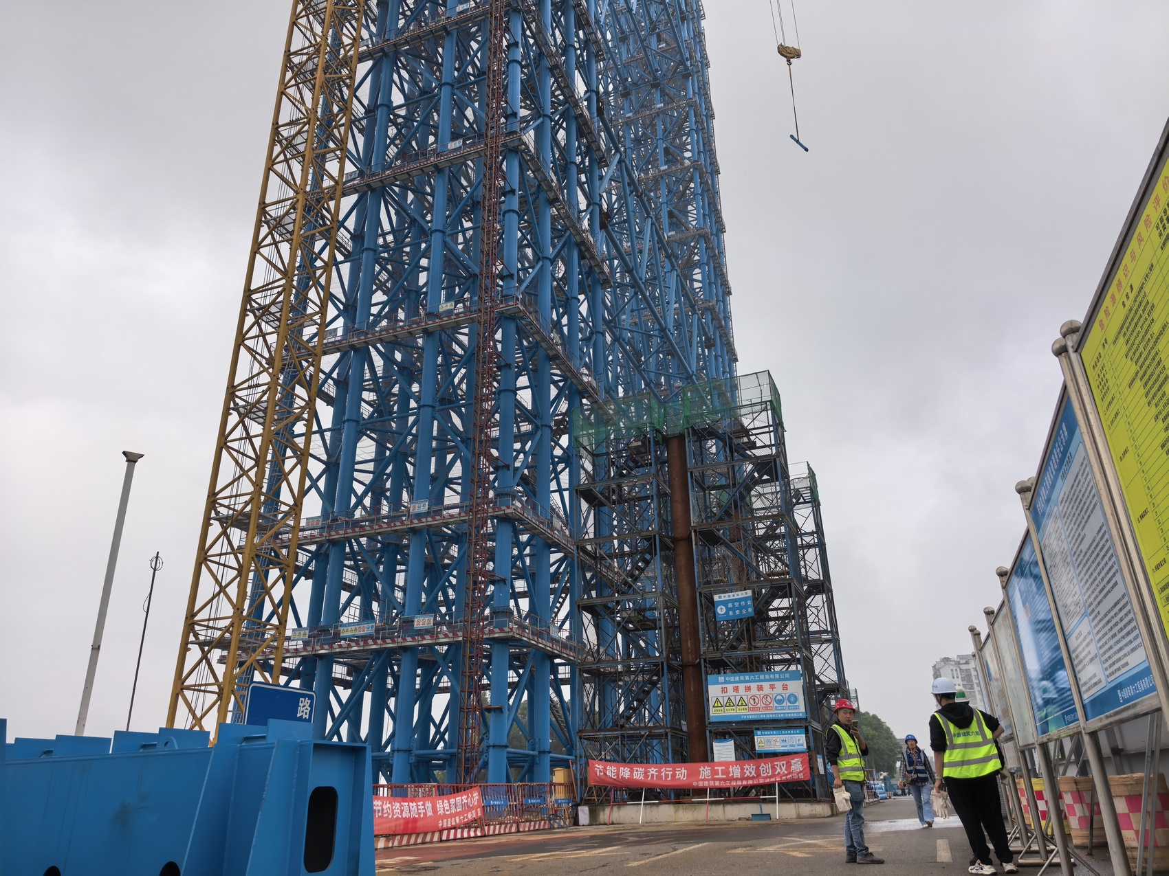 抬头望去,高大的扣塔已拔地而起。“目前扣塔已完成13层结构施工,还剩最后2层。这15层完成后,上方还将进行高达20多米的缆塔施工,这是接下来的一大技术难点和重点。”房雄飞指着快有塔吊高的施工面说道。与此同时,北岸引桥的桩基施工也在同步推进,已完成15根桩基。
