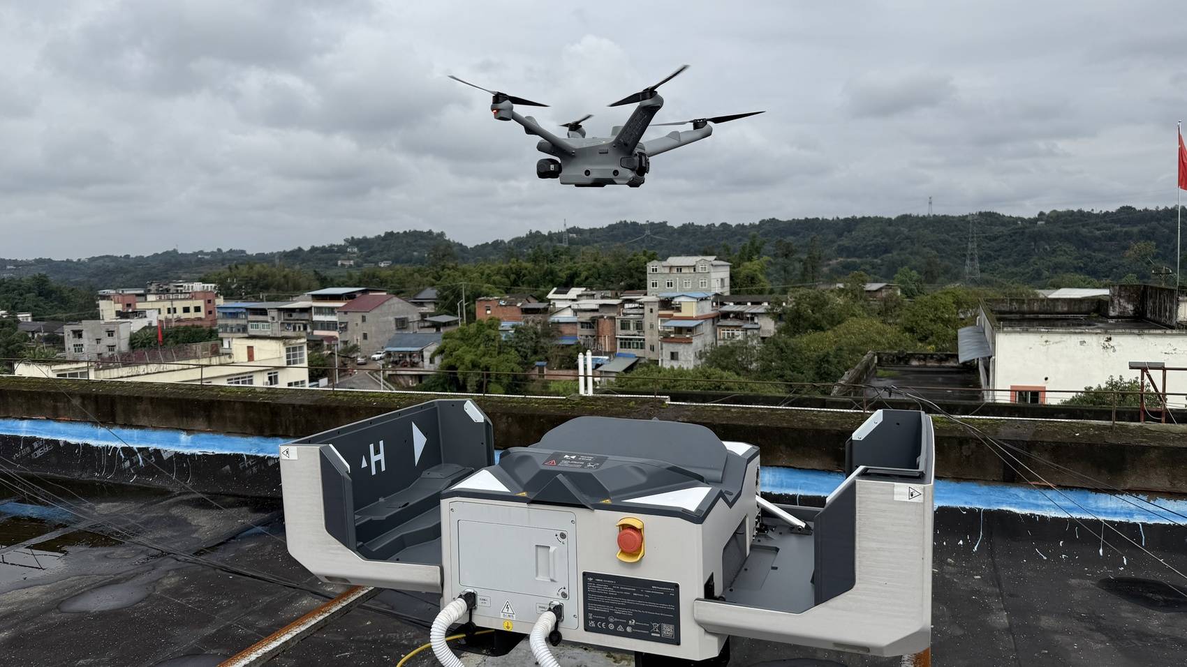 无人机机舱的舱门缓缓打开,伴随着机翼高速转动的声音,无人机蓄势待发。