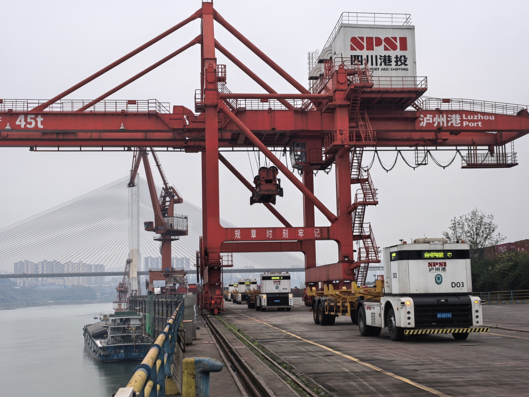 冬日的长江,清澈开阔。12月26日,在泸州港国际集装箱码头3号泊位,“扬鹏2001”号货船正在卸货。码头上巨大的龙门吊之下,数辆无人驾驶新能源集卡排成一列,等待将货物转运至堆场。