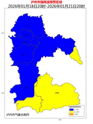同时,泸州市防灾减灾救灾委员会办公室发布强降温蓝色预警风险提示:预警时段为2026年1月18日晚至21日。