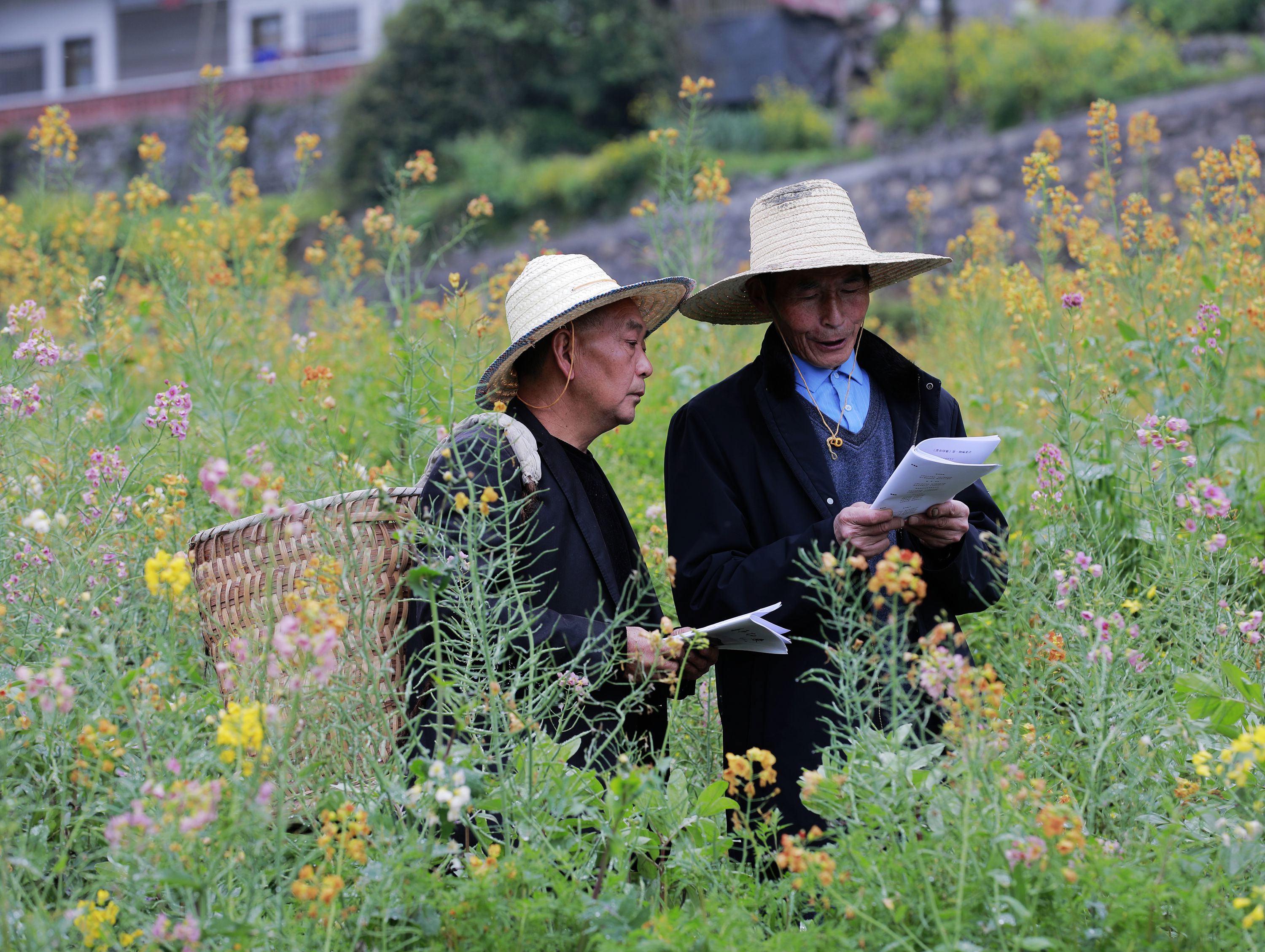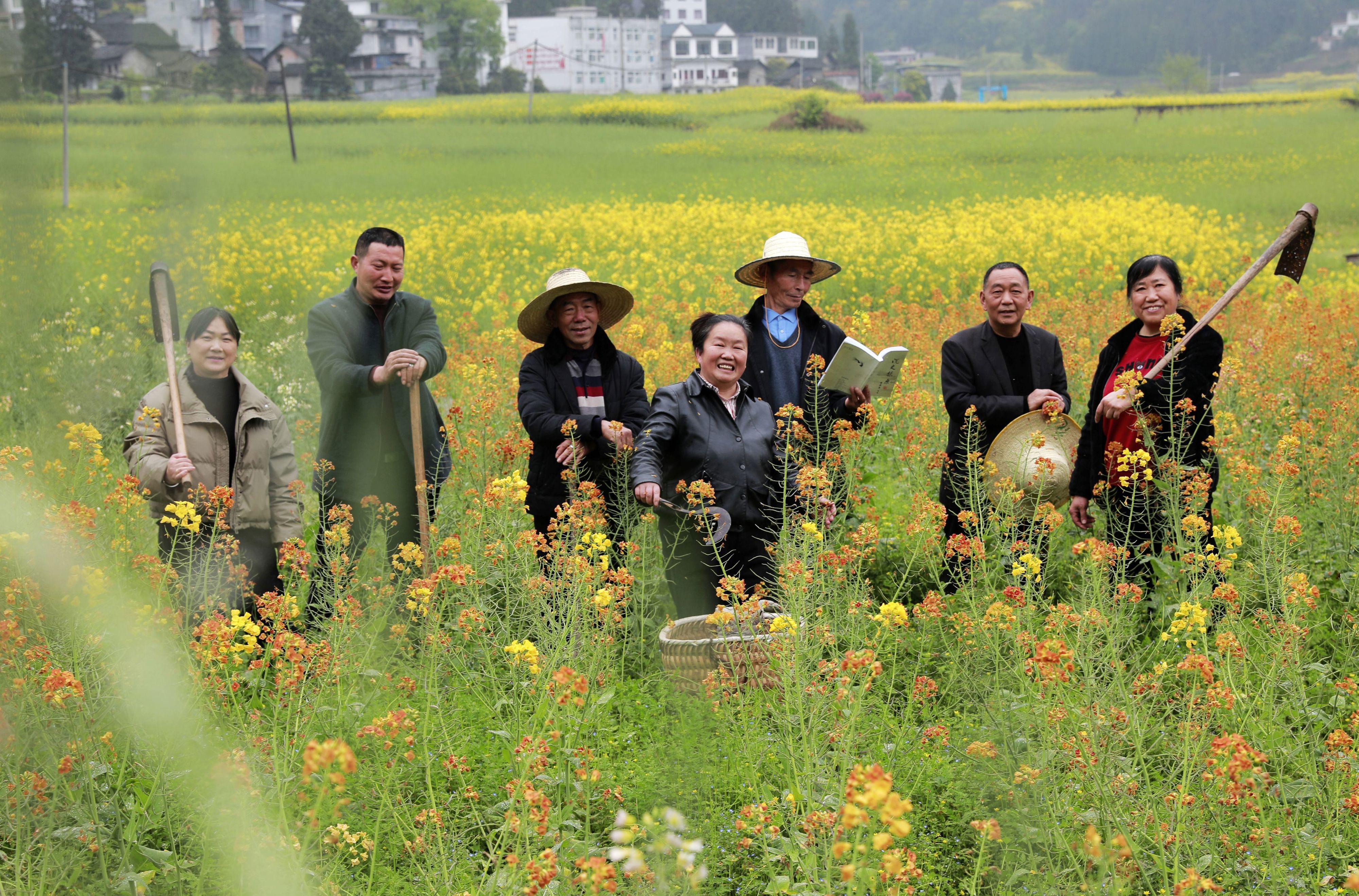 “烂漫云溪畔,霞光绕岭巅。牧童鸣翠笛,彩蝶舞花田。”唐本泉站在七彩油菜花地里,扯开嗓子朗诵着自己新写的《普市春天》。他的声音算不上洪亮,却在这片他耕种了大半辈子的土地上,显得格外有力。一旁的舒香荣听完,笑着和了一首:“暖日轻笼十里春,黄花漫野接苍旻。溪边燕舞随风远,竹叶炊烟入暮邻。”