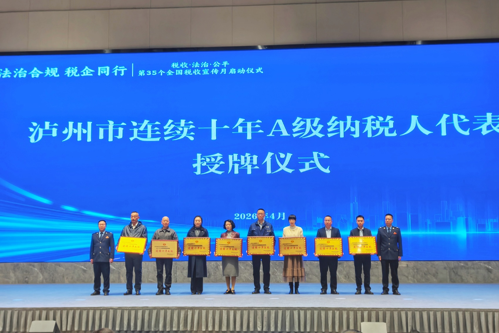 活动现场,国家税务总局泸州市税务局公布了泸州市连续十年A级纳税人名单,共计39家。现场为来自全市各县(区)的8家优秀企业代表集中授牌,共同见证这“十年磨一剑”的荣誉时刻。