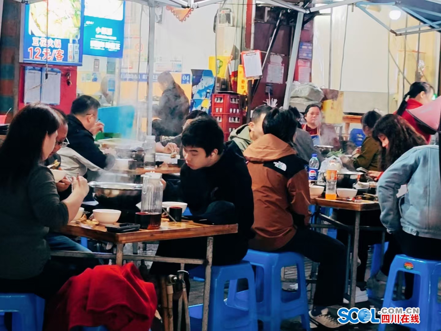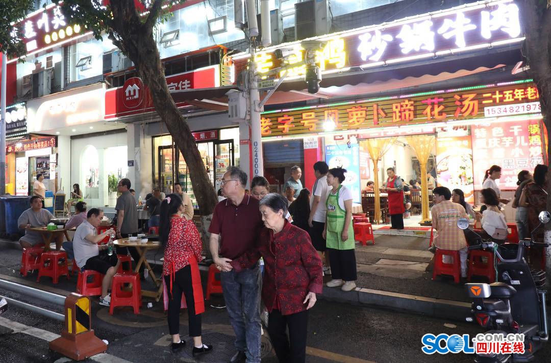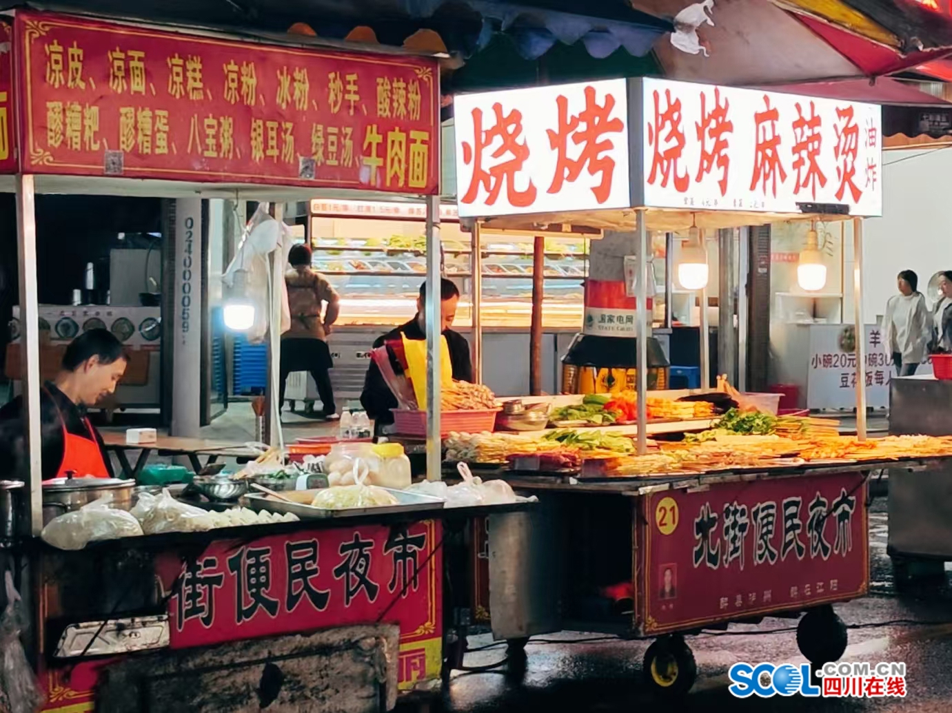 四川在线消息(张红 泸州频道 龙欣雨 文/图) 暮色渐沉,华灯初上。泸州市江阳区北城夜市在熟悉的喧嚣中苏醒:邓氏米花糖摊位前,串串香热气袅袅;风萝卜蹄花汤店里,早已座无虚席;烤架上肉串嗞嗞作响,手打柠檬茶的捶打声清脆入耳……曾经游走于城市角落的流动摊贩,如今在这片规划有序的天地中找到了安稳的归宿。