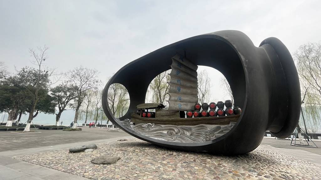 时光再翻几页,澄溪口的河坝变成了单碗广场。广场中央立着巨大的“单碗”雕塑,两侧碑石刻着《酒城赋》与《单碗歌》:“两江一河泸州城,单碗喝酒早成名。”2000年,滨江路改造捧回联合国人居奖,沿江步道成了泸州人散步、吹江风的好去处。