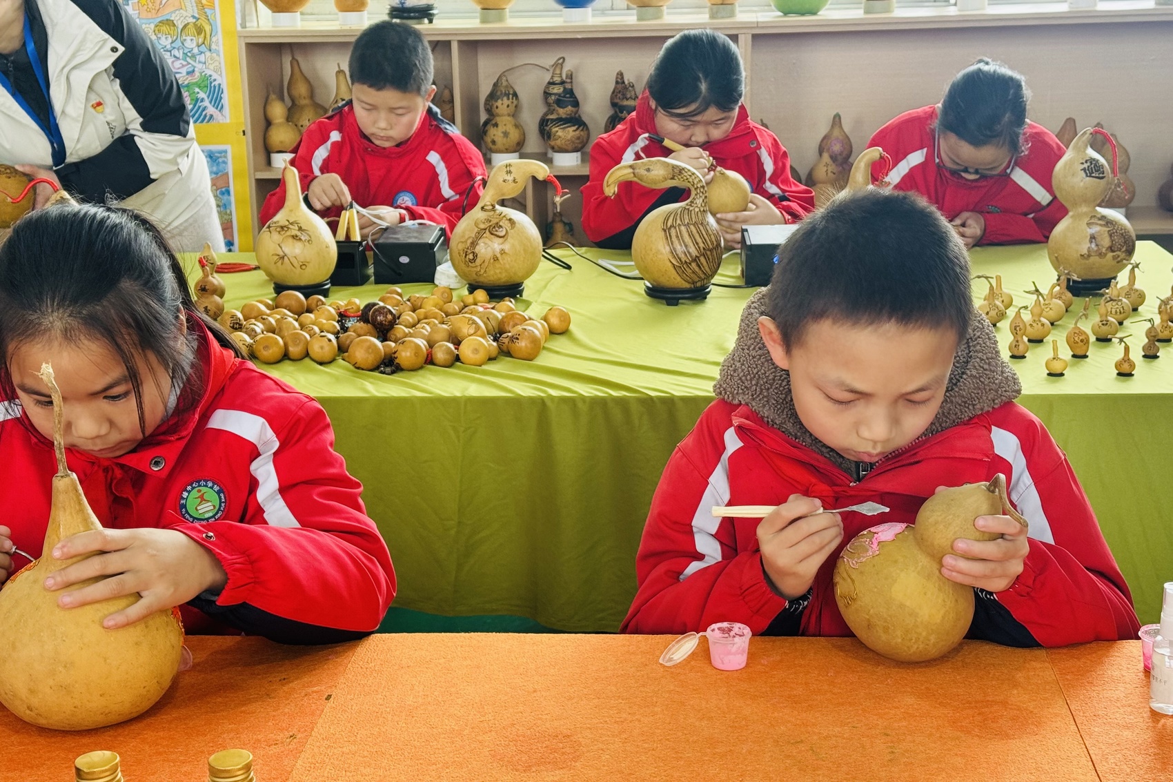 泸县牛滩镇玉峰小学校的学生专注地在葫芦上创作。