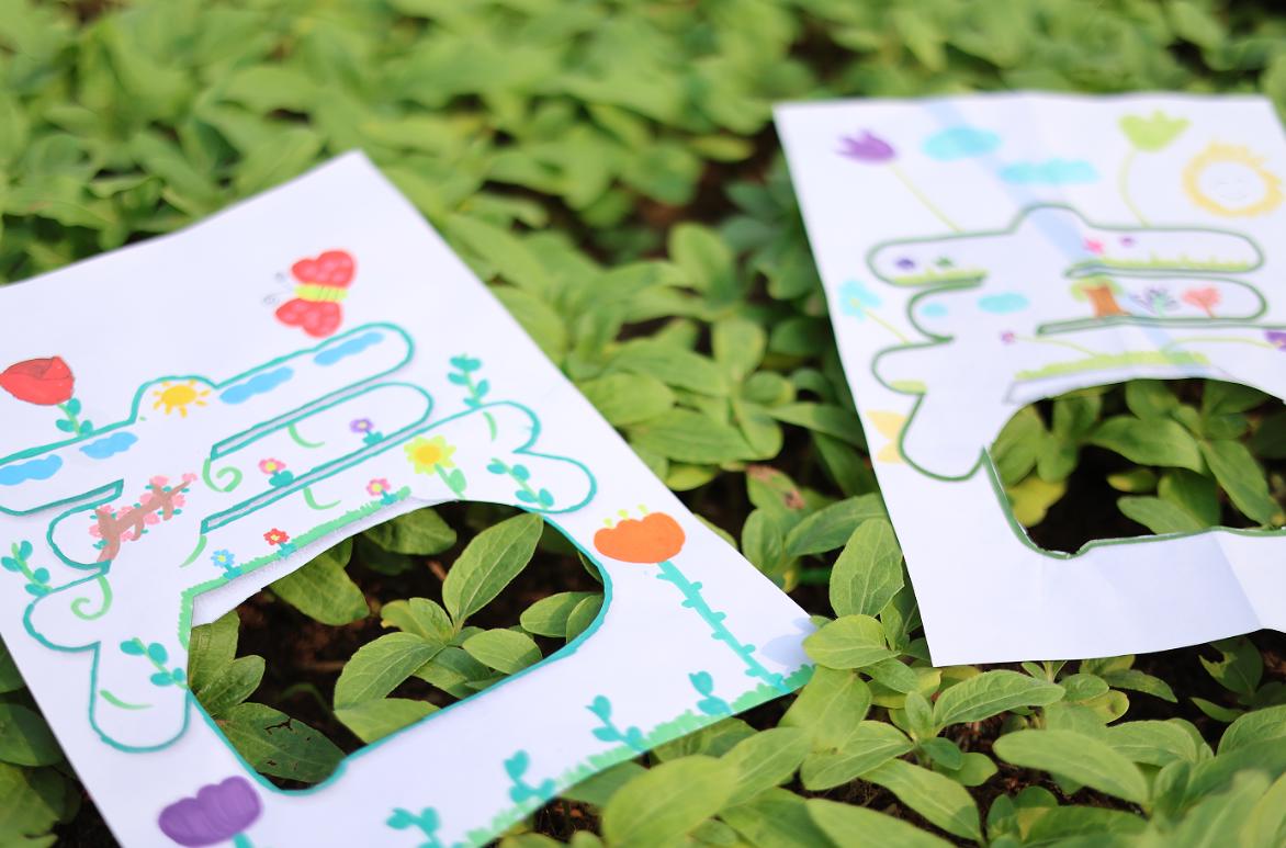 草坪上,男生们趴在嫩绿的菜畦间,把“春”字覆在叶片上:“我们的春字是绿色的!”阳光透过叶隙洒在纸上,风里都裹着泥土与花香的气息;树荫下,孩子们不断调整角度——紫的花、褐的枝、嫩的叶,都透过那一方小小镂空,成为了画作的一部分。艺术不再局限于纸面,而是与自然万物温柔相拥。