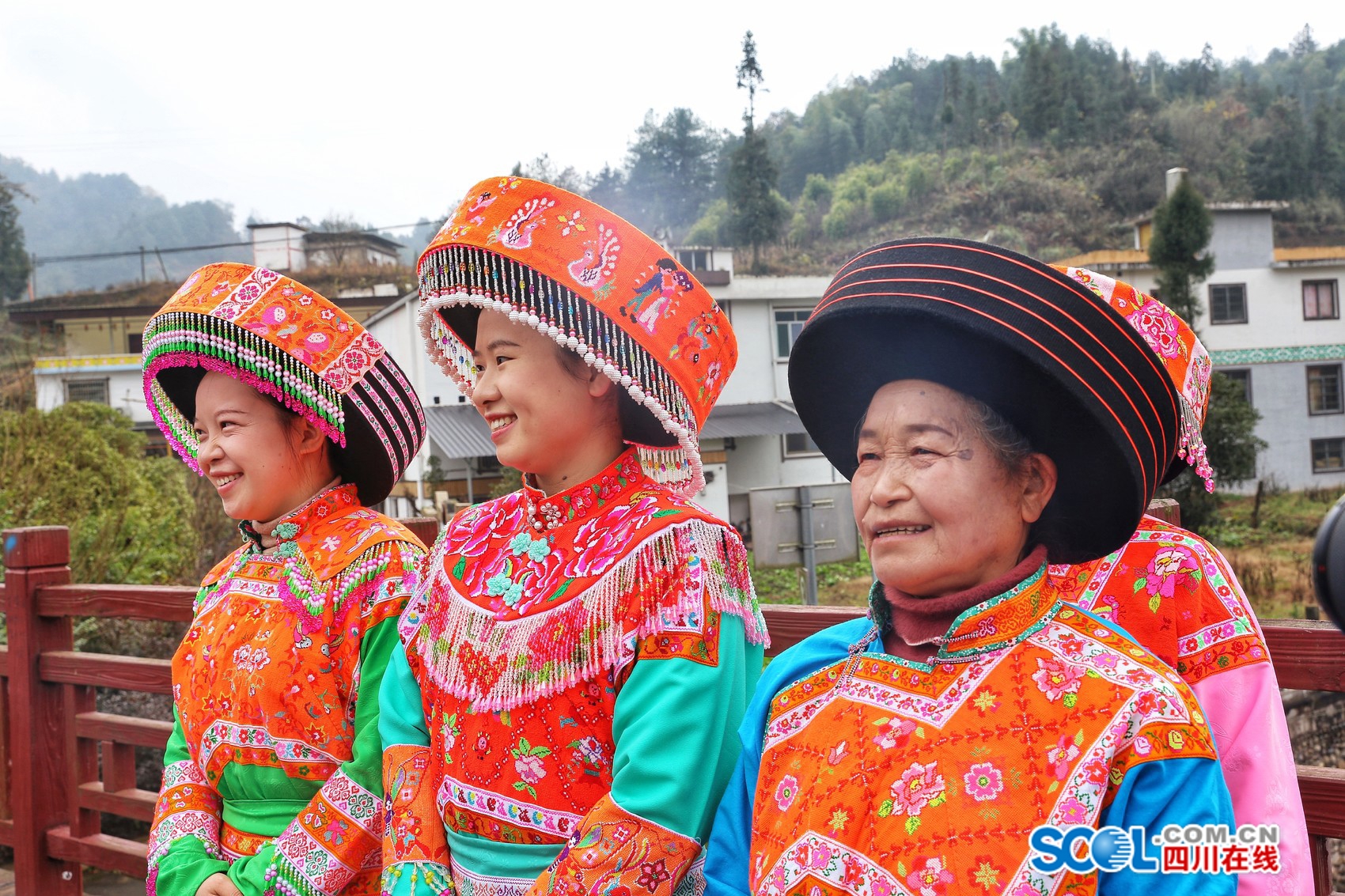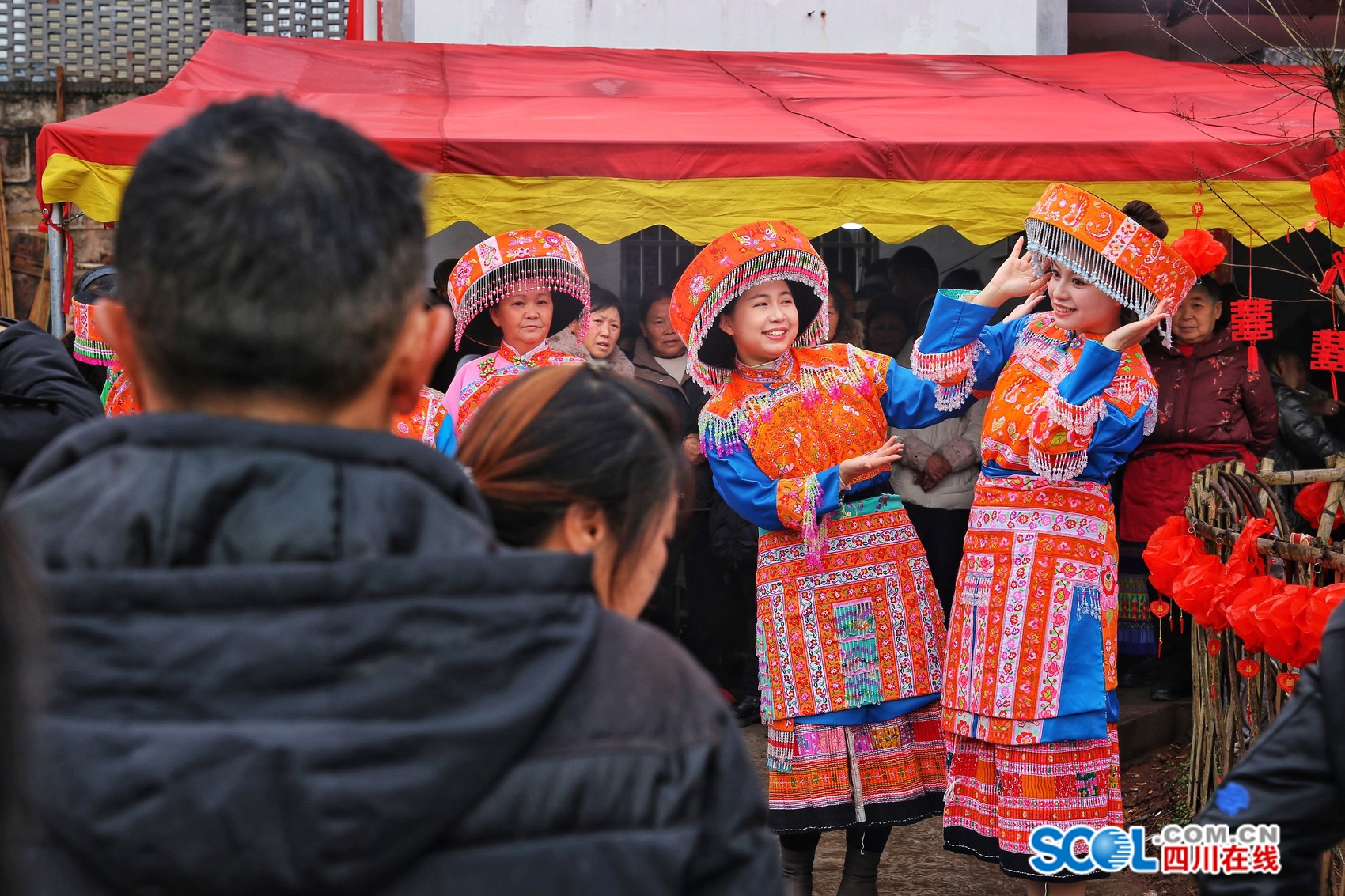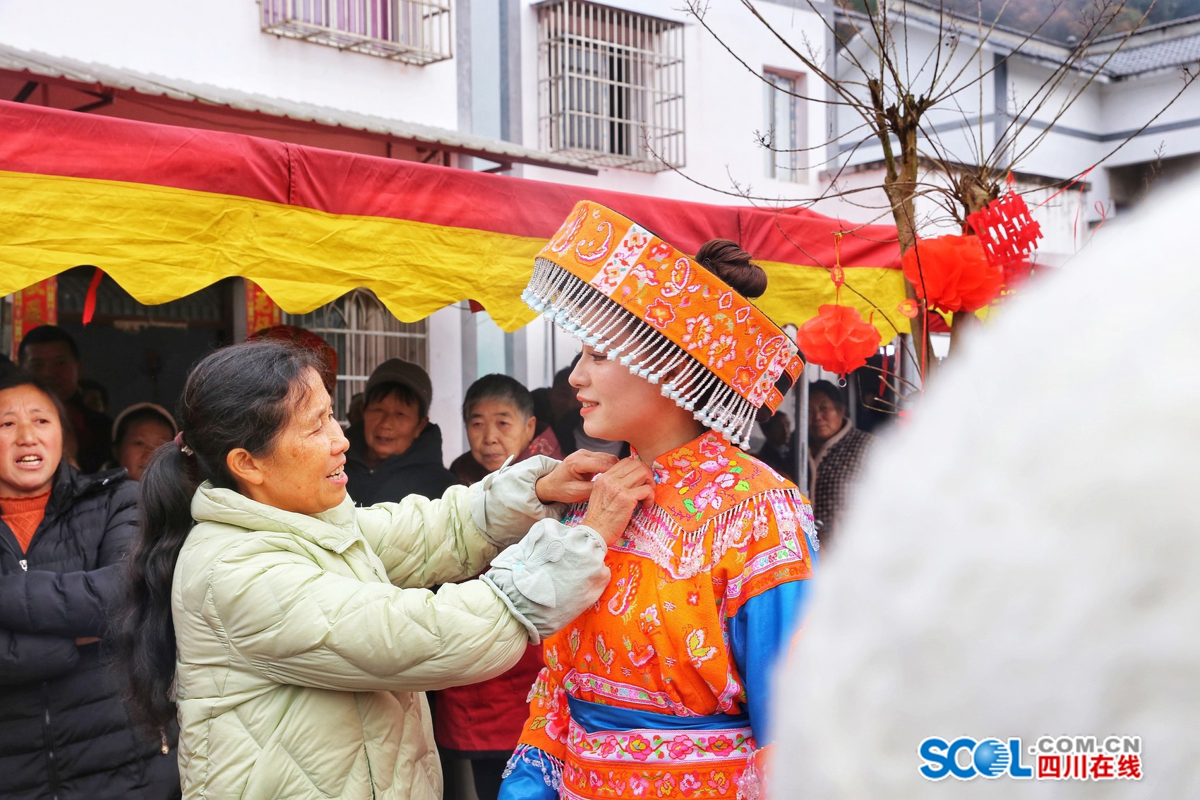 12月10日,泸州市古蔺县大寨苗族乡富民村,一户苗族人家张灯结彩,为即将出嫁的女儿陶倩筹备家宴。屋内亲朋齐聚,欢声笑语中,新娘陶倩换上母亲王秀英亲手缝制的苗绣嫁衣——一件以蝴蝶纹、孔雀、牡丹花等传统图案交相辉映的华服。