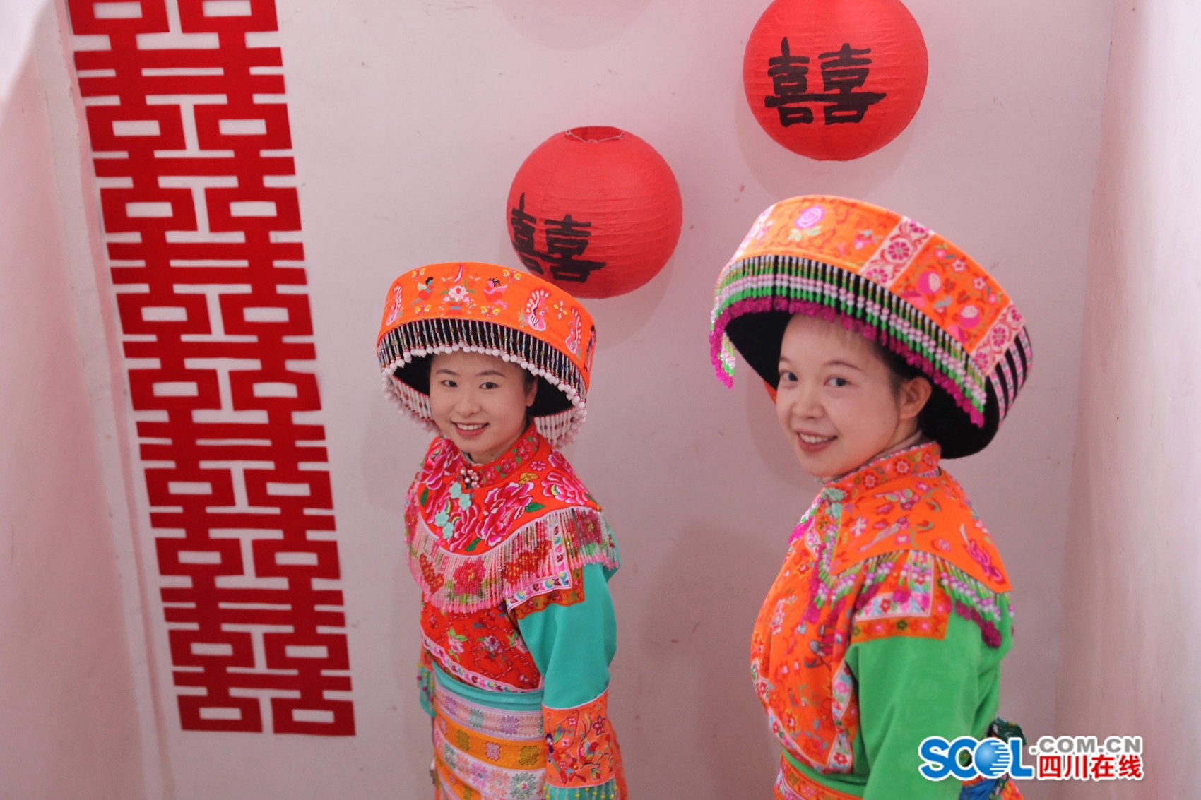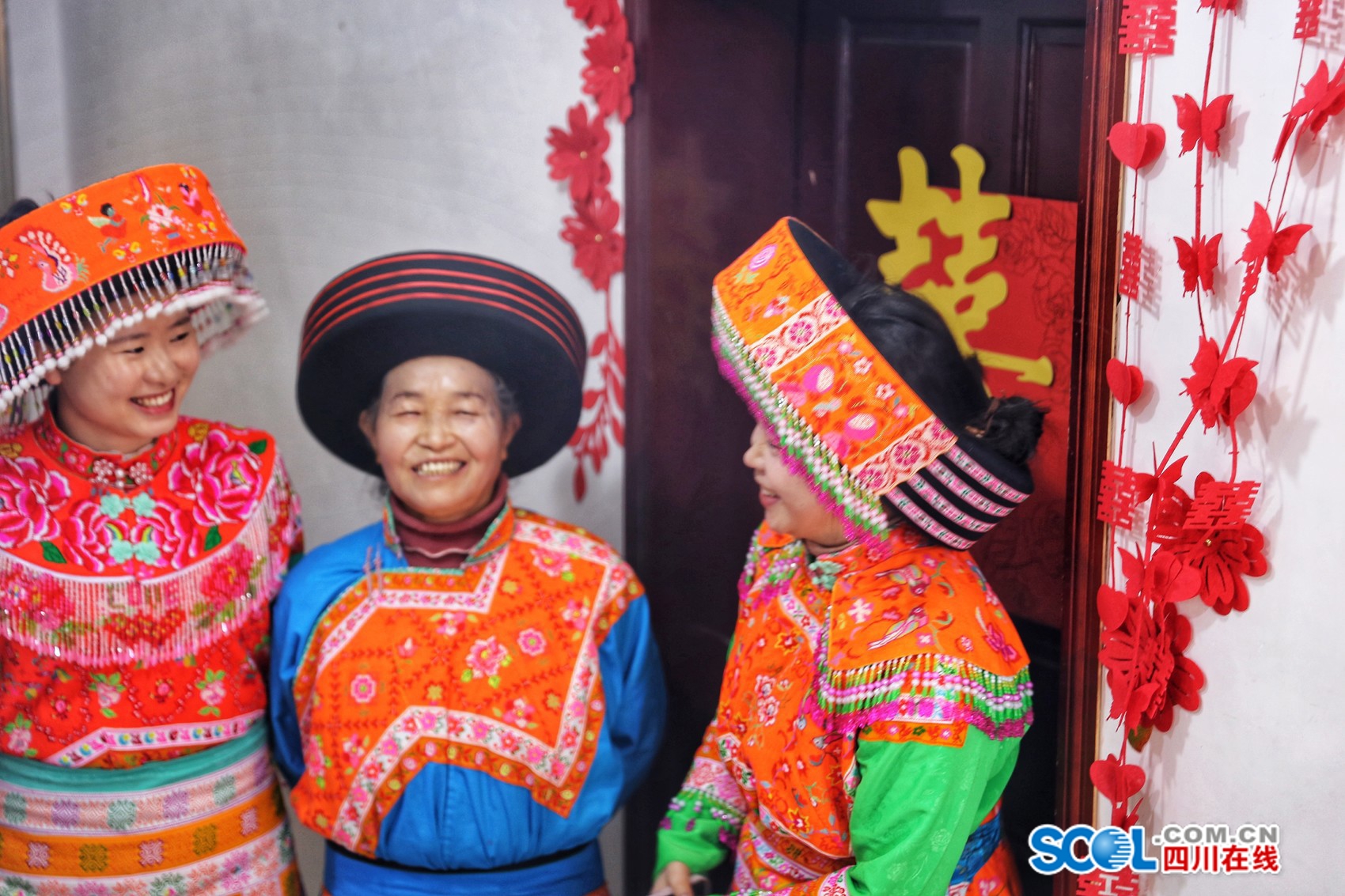 新娘的嫂子马艳梅和妹妹陶艳,也身穿苗服送陶倩出嫁。
