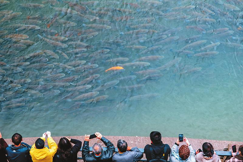 2025年11月11日 宜宾合江门金沙江与岷江交汇处,野生鱼群正追逐着游客抛撒的鱼食。
