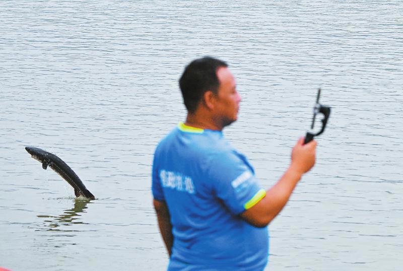 2023年6月6日 宜宾市江安县长江协助巡护队队长周涛在直播放流活动时,一条长江鲟跃出江面。