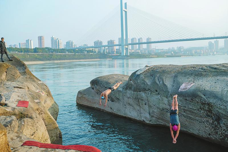2026年1月8日 泸州市纳溪区“海豚湾”,冬泳爱好者正从形似海豚的礁石跃入碧江。