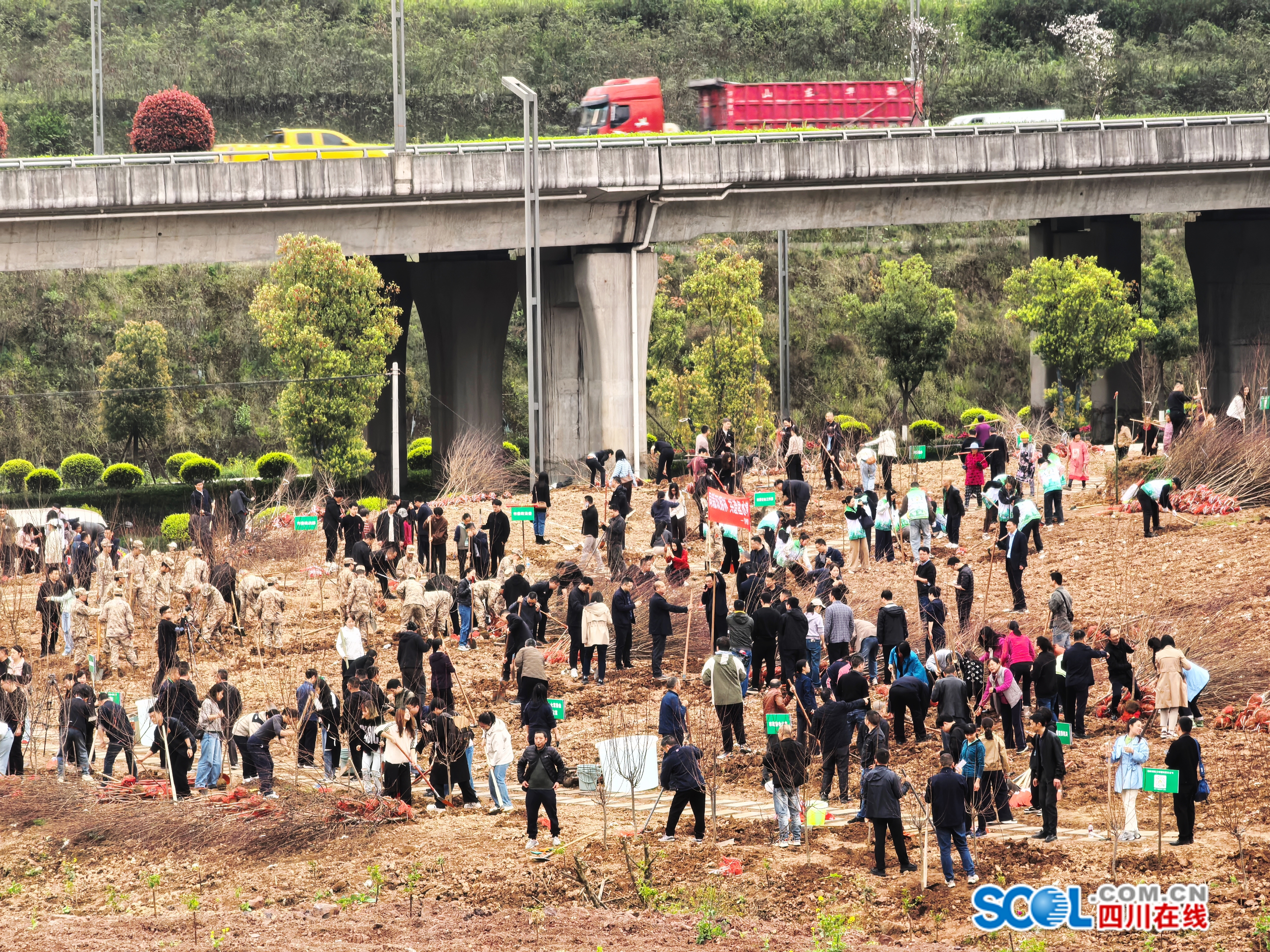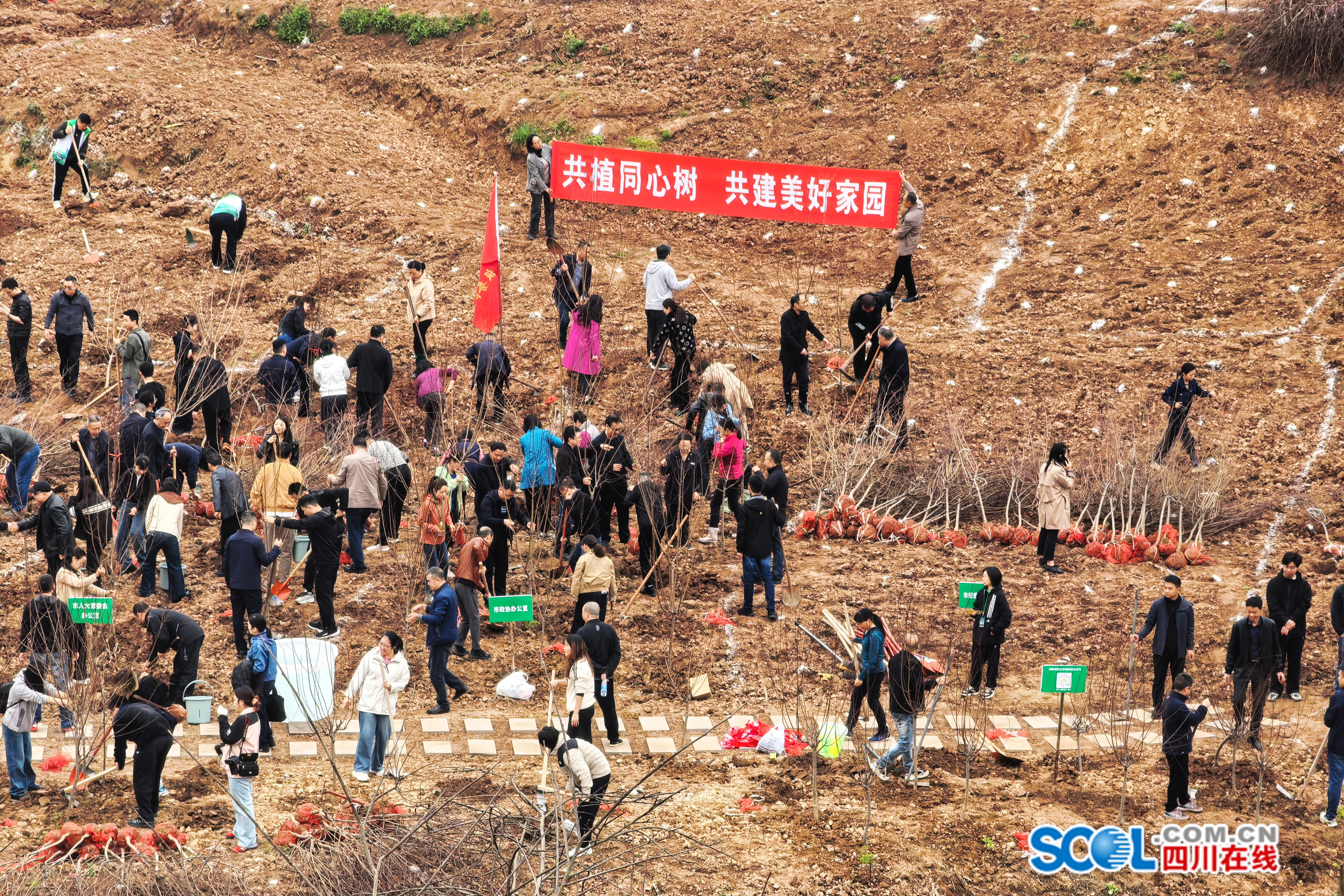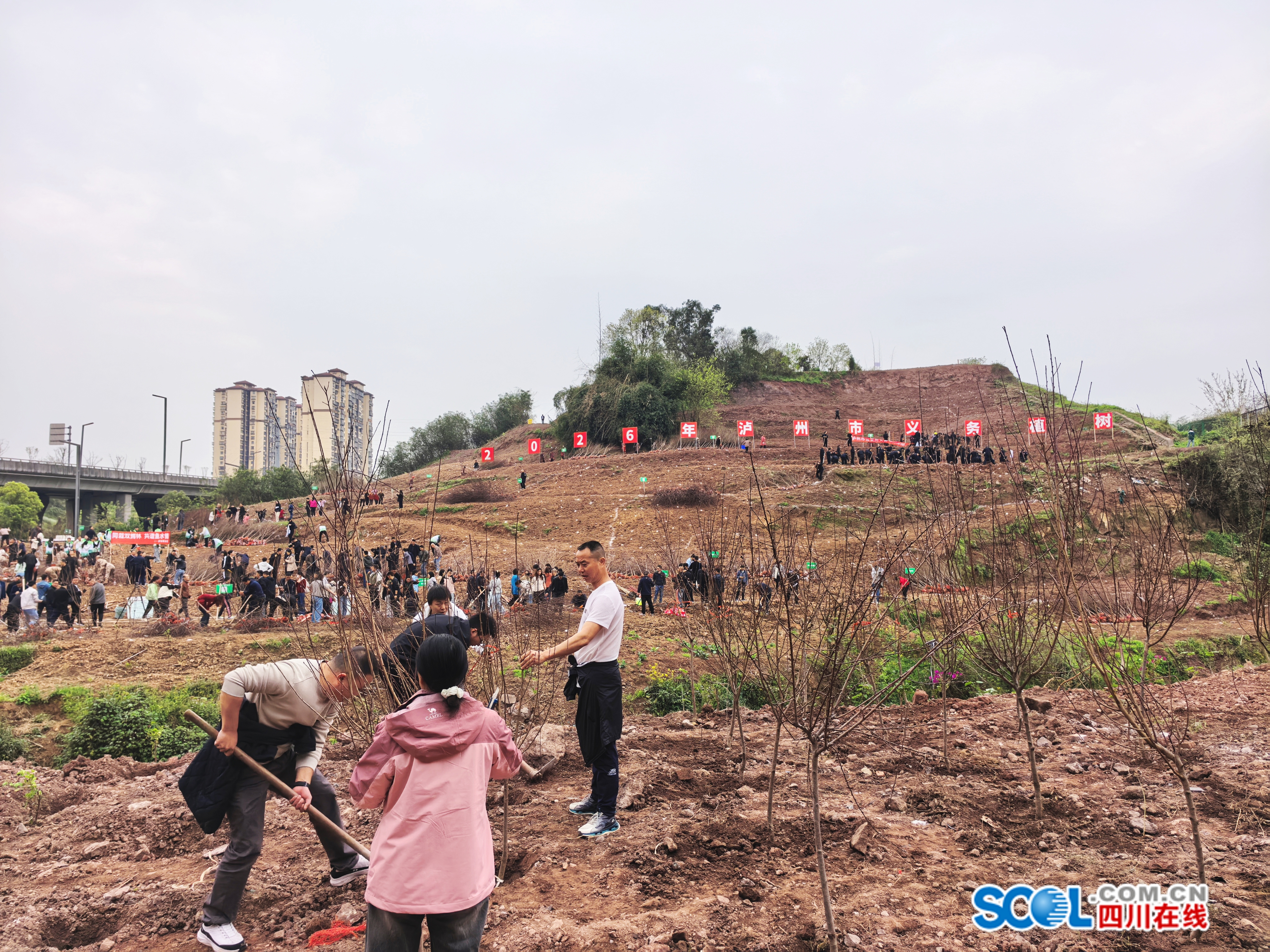 一个个土坡上,大家三五成群,分工协作,按照“定点栽植、科学栽植”的要求,挖坑、栽树、填土、浇水……最后再和自己栽种的树苗合影一张,现场大家的植树热情高涨,以实际行动为泸州的城市绿化增添一抹新绿。
