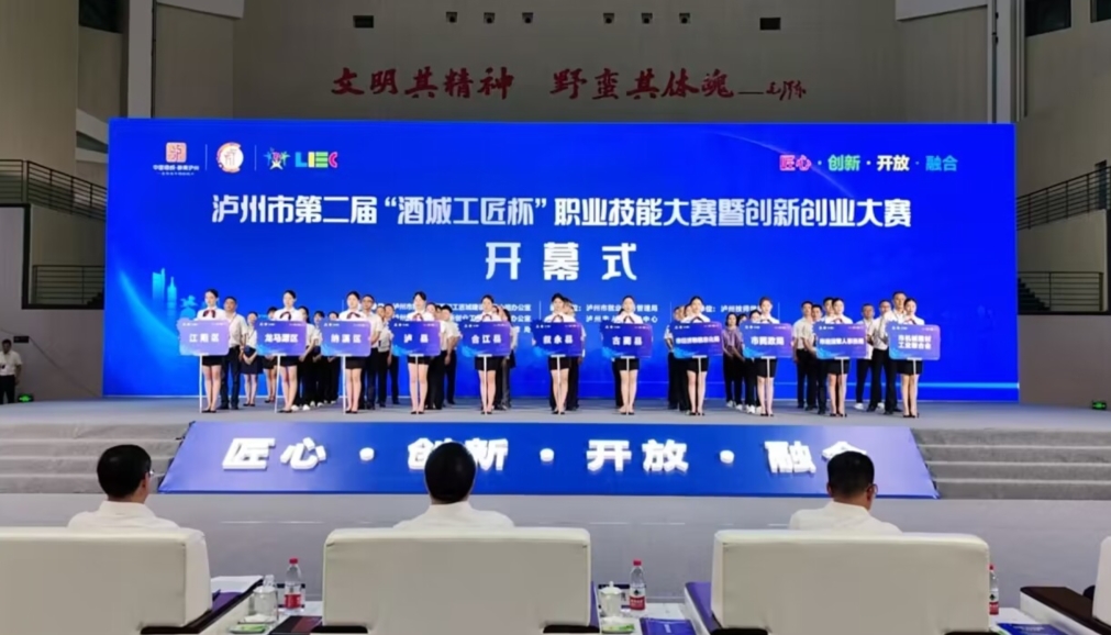 开幕式上,11支参赛队伍逐一登台亮相,本场比赛以“匠心、创新、开放、融合”为主题,以泸州市委“一体两翼”特色发展战略为引领,围绕重点产业发展、重点群体服务,精准对标省赛、国赛、世界赛,围绕职业技能大赛和创新创业大赛两个版块,其中职业技能大赛设汽车维修、砌筑、数控车餐厅服务、健康和社会照护(养老护理)、电子技术6个赛项,创新创业大赛分创新创业组、大学生创业组、乡村振兴组三个组别举行。
