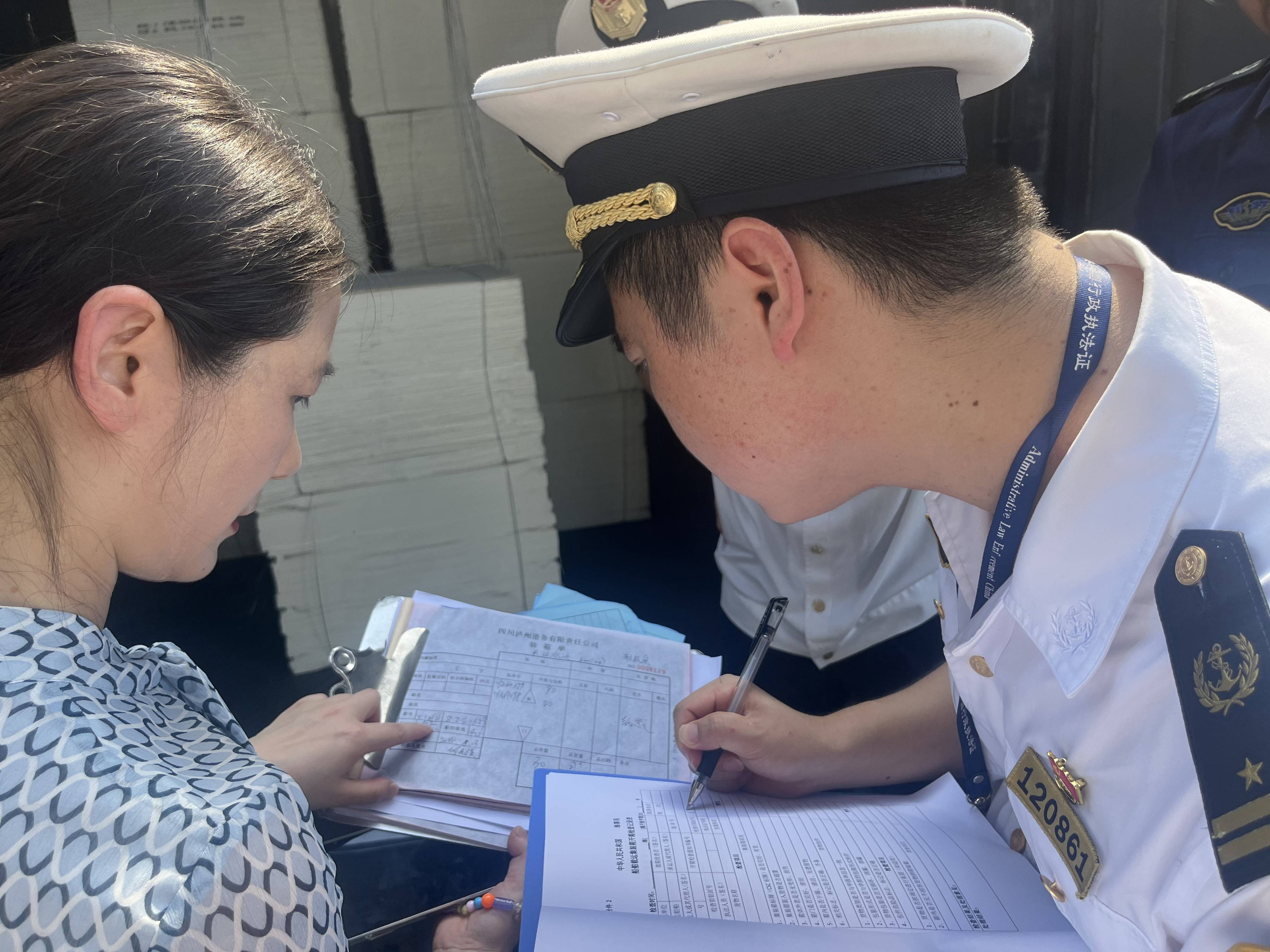 在泸州港,泸州海事局通过核对船舶进出港报告、货物申报信息、货主询问了解等方式,提前收集本次集装箱货物装箱信息,掌握货物品名、规格和数量。在货主和港口方代表共同见证下,检查人员随机抽选拟通过船舶载运的集装箱进行开箱,详细核对集装箱箱体有无变形、破损等情况,核查标牌、标志是否清晰规范,详细比对装载货物是否与申报信息一致。