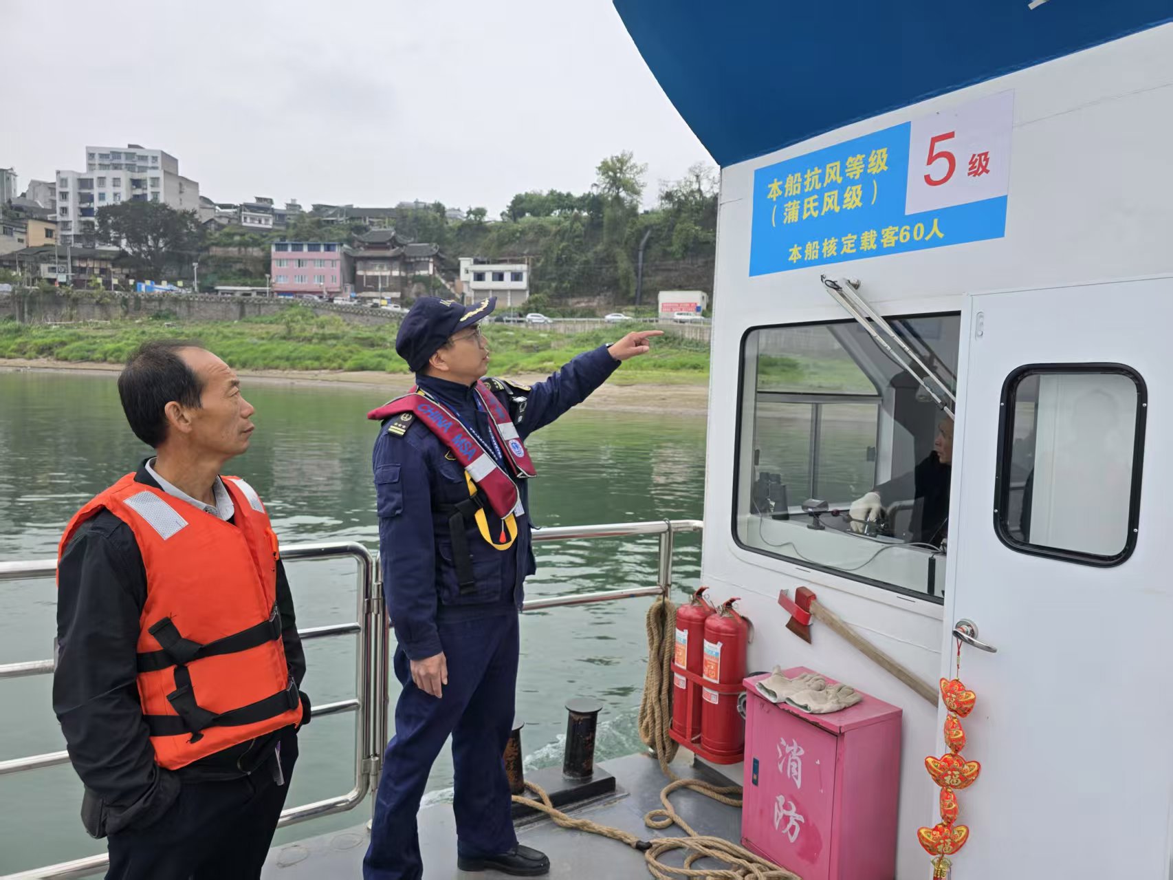 针对检查发现的问题,执法人员现场督促船方立即整改,实行闭环管理。此外,执法人员现场向船员普及汛期水上安全知识,讲解渡船倾覆、人员落水等应急处置要点,压实渡运企业安全生产主体责任。(泸州海事局供图)