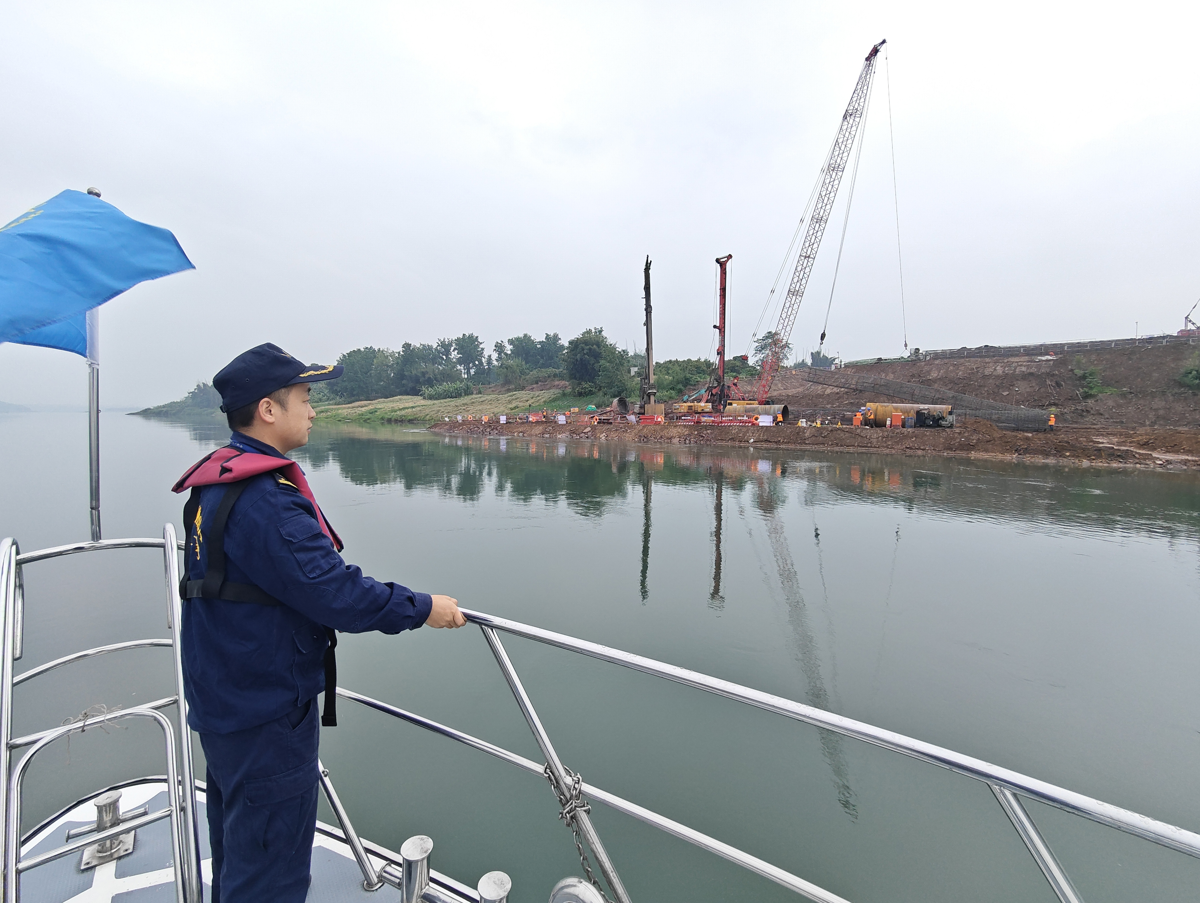 最后,执法人员前往大脚石水工项目施工水域,结合当前水位上涨实际情况,现场查看施工对水域水势流态和通航安全的影响,督促施工单位进一步细化汛期安全保障方案,明确通航管控要求,全力消除汛期水上安全隐患。
