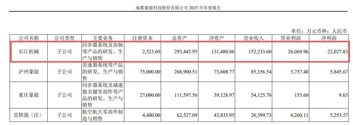 4月23日,豪能股份发布2025年年报,让人得以一窥长江机械的真正实力。公司全年实现营业总收入26.89亿元,同比增长13.94%;归母净利润2.77亿元。其中,长江机械一家便贡献了15.22亿元营收和2.2亿元归母净利润,撑起了豪能股份大部分利润来源。