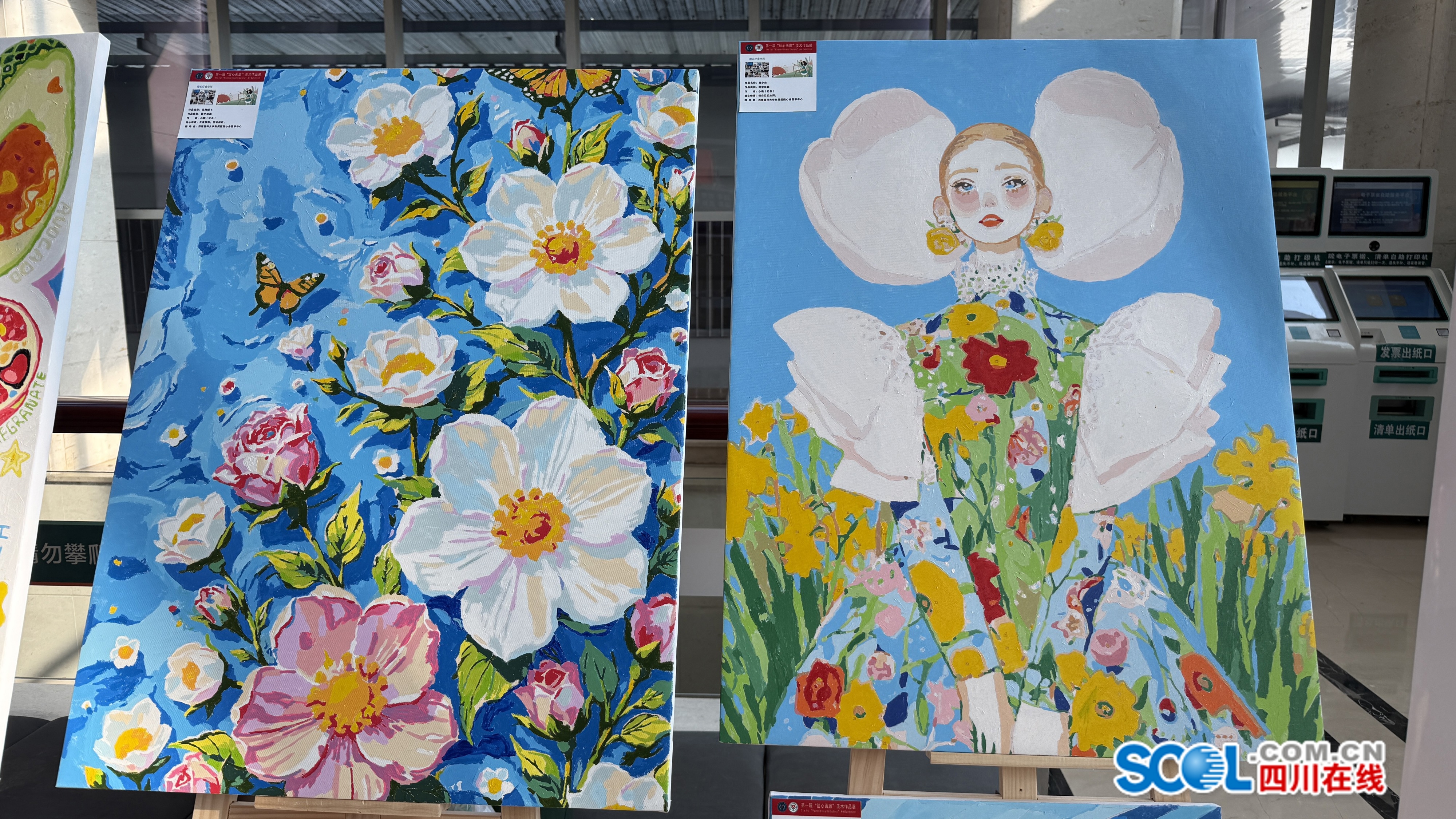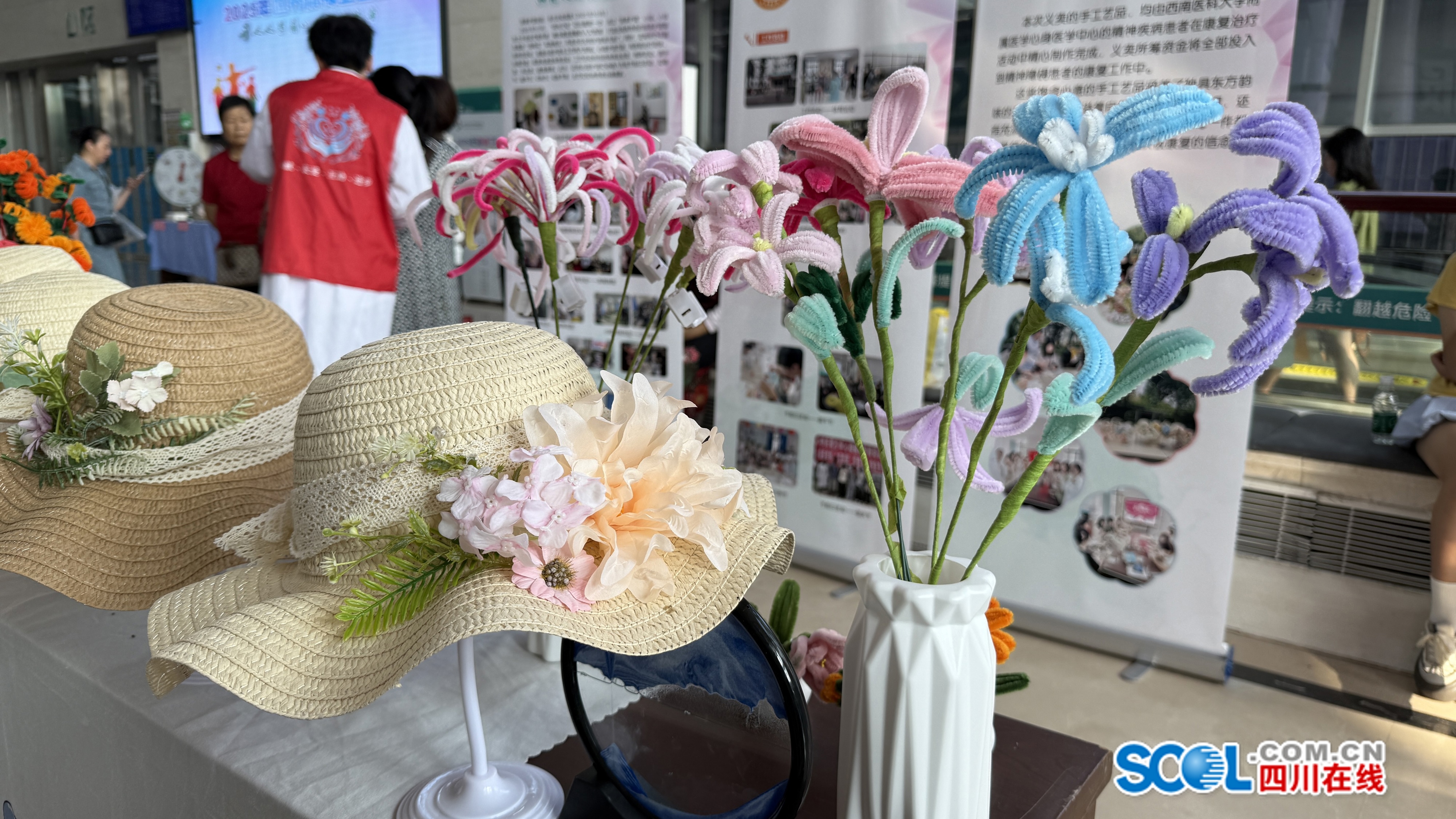 在门诊大厅右侧可以看到,桌上摆放了台灯、团扇等手工艺品,木质展架上放着精美的绘画。“这些手工艺品和绘画都是院内精神疾病患者在康复治疗活动中制作完成的。”西南医科大学附属医院心身医学中心副护士长何容芳说。
