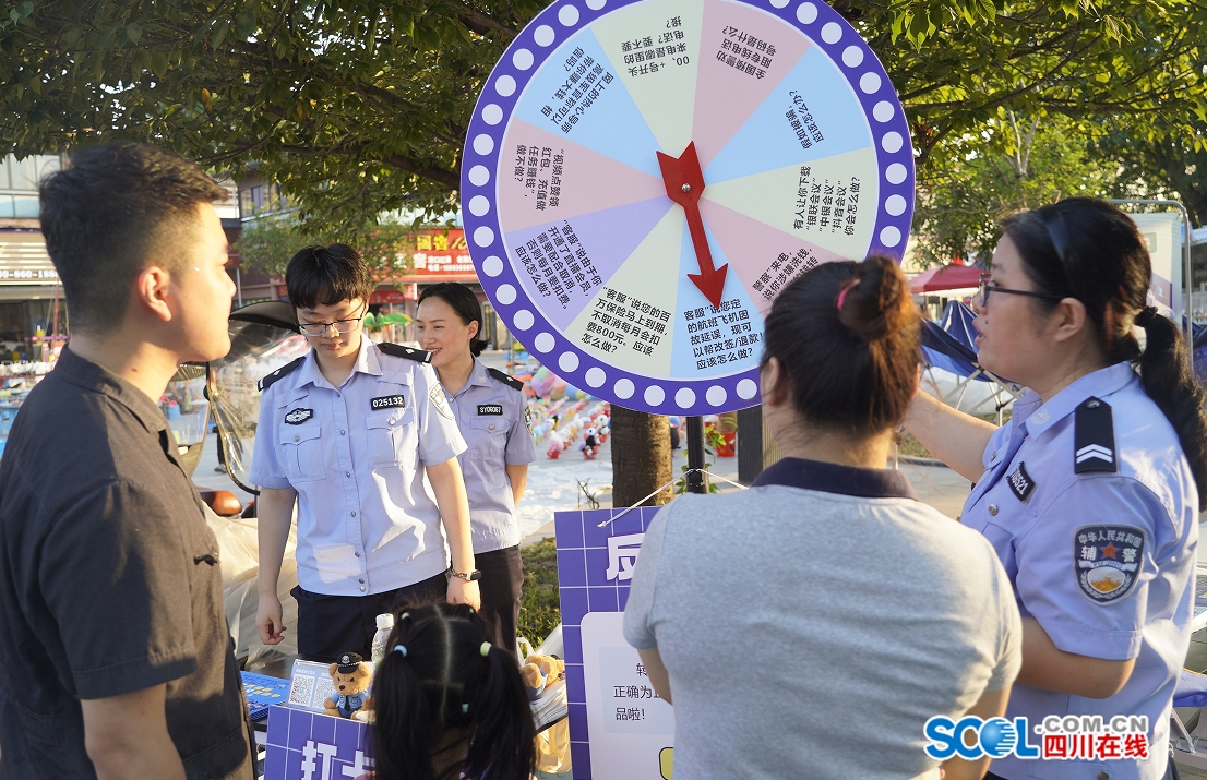 活动现场,泸县人民法院干警和公安局民警向路过的群众讲解反诈常识,针对新型养老诈骗话术等进行重点提醒,运用“反诈转盘”,引导大家参与转盘、积极答题,在游戏互动中普及刷单、假客服等套路,还设置了打卡区,供群众分享交流反诈心得,提升防骗识骗意识。