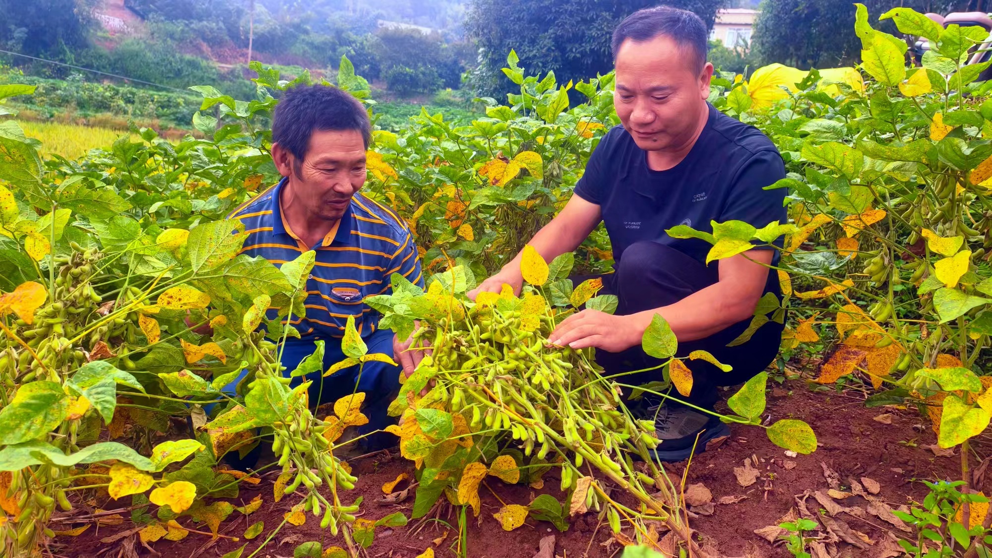 四川在线泸州消息(周超文 刘晓梅 文/图)金秋十月,大豆飘香。近日,走进纳溪区新乐镇伏龙村,不少农家房前屋后的“边角地”甚至部分秋收后的高粱、玉米地头,目及之处都被金黄的大豆叶连接成片,一株株豆秆上结满了密密麻麻的豆荚,一串串豆荚籽粒饱满,长势喜人,丰收在望。如今的新乐镇,前些年被遗忘的“边角地”,正长出富民增收的“黄金豆”。