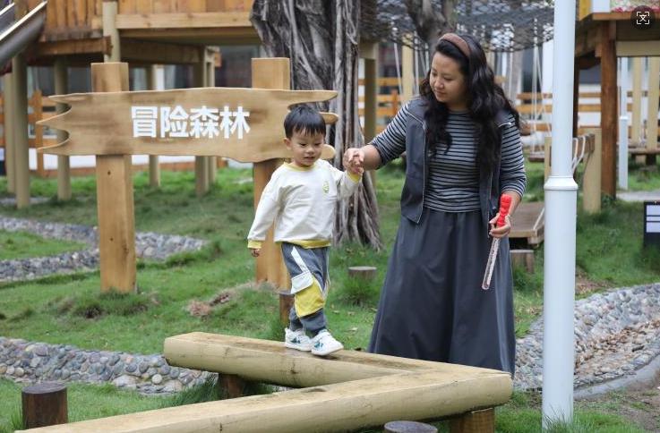 居民蔡茂兰带着孩子在儿童户外游憩区玩耍