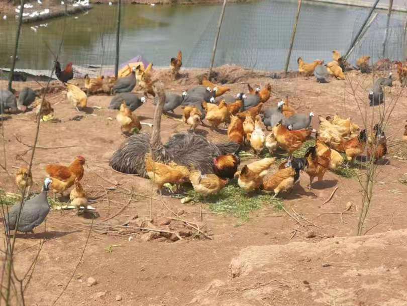 在现场可以看到,采摘后的葡萄架和桃林下,成群的土鸡自由自在地觅食、撒欢、休憩。
