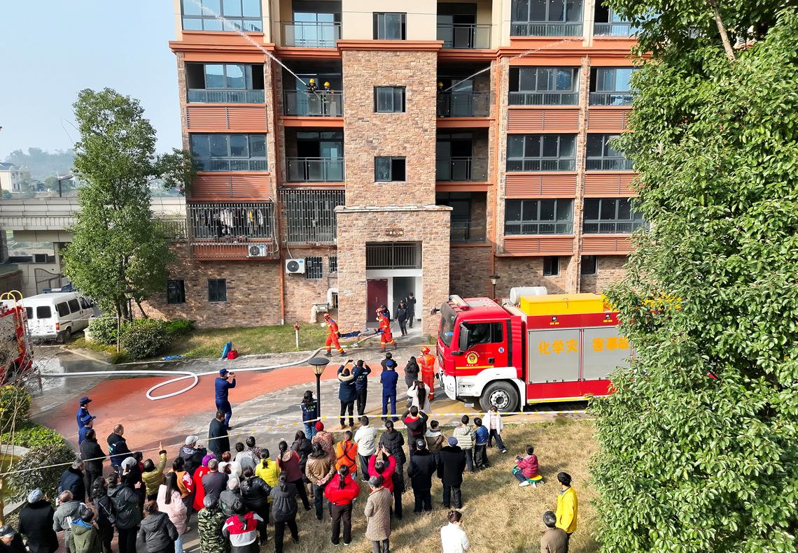演练选址太伏镇一高层建筑,模拟建筑内某楼层不慎引发火灾,火势快速蔓延并向上扩散,楼内有人员被困,情况危急。接到模拟报警后,泸县神仙桥化工园区消防救援站指挥中心迅速启动应急响应预案,调集专业力量赶赴现场处置。演练中,队伍迅速完成火情侦察,并展开救援,全程展现出过硬的战术素养。