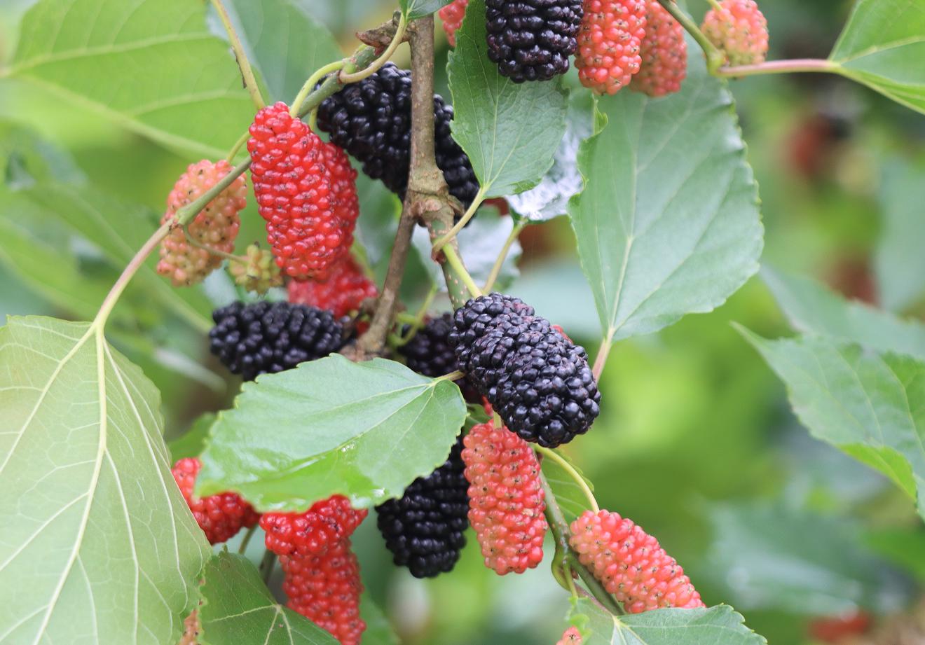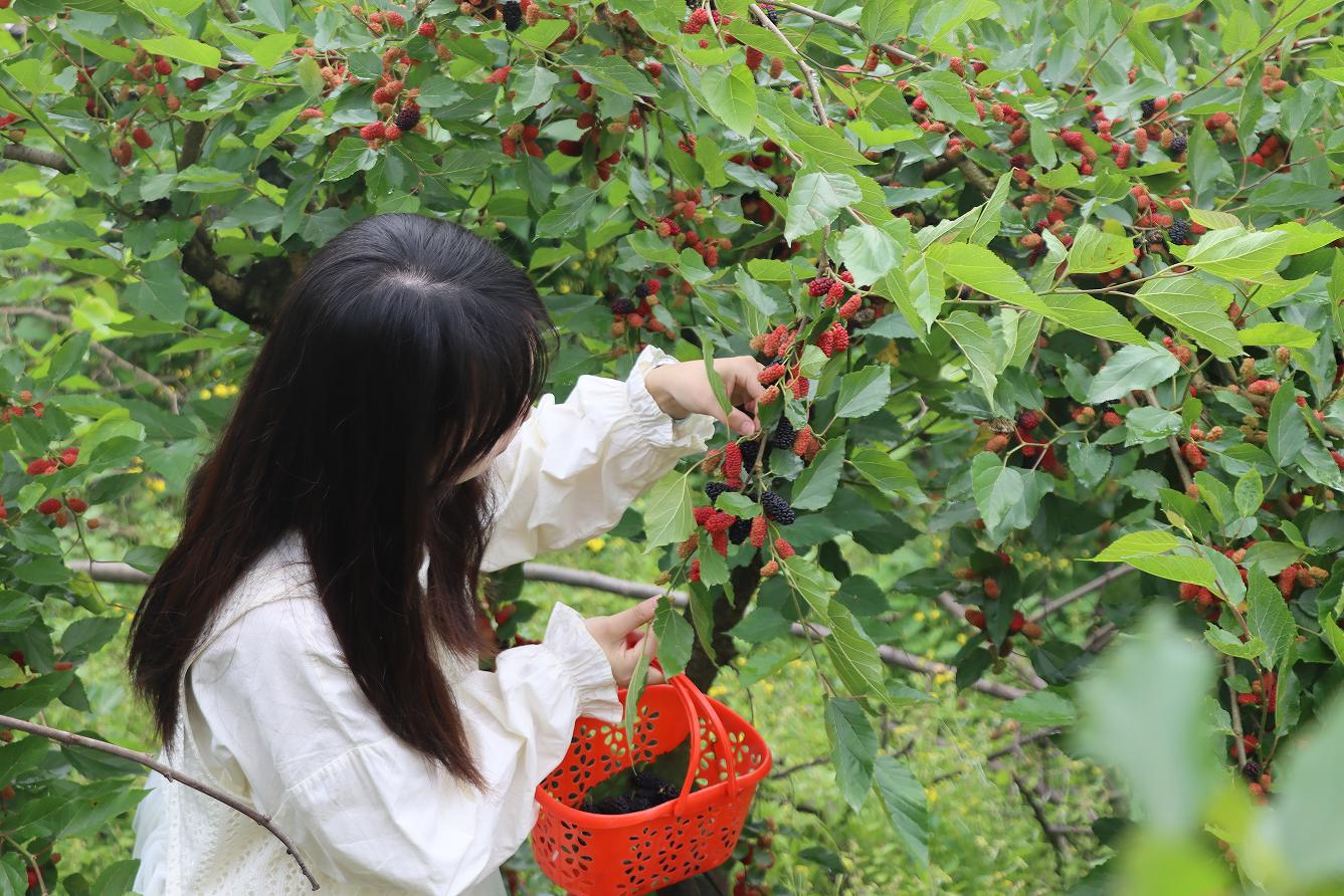 走进桑葚种植园,桑树林郁郁葱葱、长势喜人,翠绿的枝叶间,紫红、乌黑的桑葚果沉甸甸地缀满枝头,宛如一颗颗晶莹的紫宝石,在阳光的照耀下显得格外诱人。不少游客携家带口、邀约好友,穿梭在错落有致的桑林间,手提小篮,低头挑选、采摘熟透的桑葚。